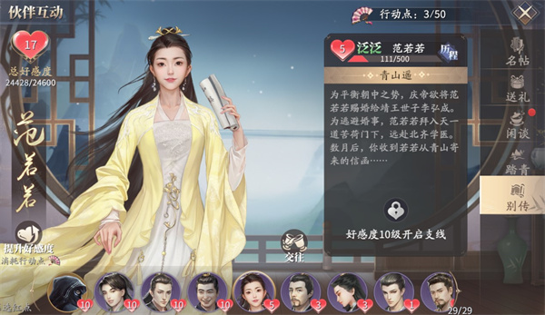 每个伙伴别传可获得5万经验,并不是所有伙伴目前都有别传。所以我们获取的伙伴礼物从第1天就要优先给到有别传的伙伴,如范闲,范思辙、王启年等,伙伴别传开启条件是好友度达到10级,通过送礼、闲谈等方式增加好感度。