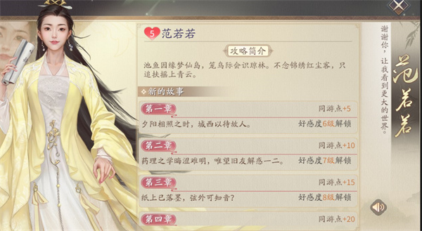 ①交通-同游按钮进入,当伙伴好感度提升到一定等级(每个伙伴不一样)即可解锁伙伴故事,可获得伙伴碎片等奖励。