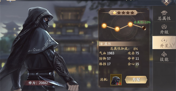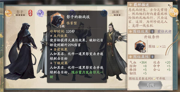 每个图组都有主卡,当提升当前图组整体星级后,可升级主卡的助战技能效果。如下:我的主卡是影子,当影子+谢必安+藤子京+林珙的总星级达到11星,即可使影子的助战技能得到提升效果如下图。
