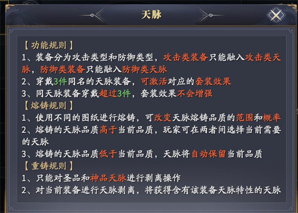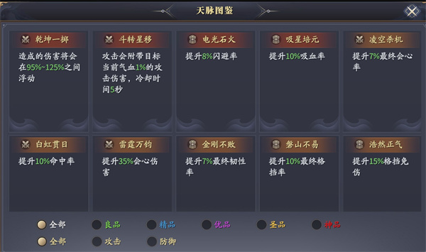 3、天脉可增加人物额外属性,且3件为一套才可触发额外属性加成。即需要触发乾坤一掷,需要3件装备都有此天脉技能。