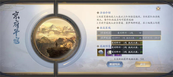京府平寇玩法为组队刷怪玩法,玩家需要组成三人及以上人数的队伍进行挑战。