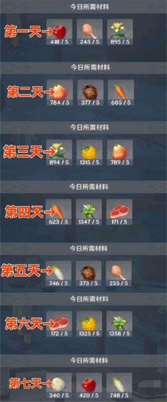 1、七天活动玩家共需要收集10朵甜甜花、10个薄荷、10个苹果、10个日落果、10个松果、10个树莓、10个胡萝卜、10个白萝卜、10份禽肉、10份兽肉、5个鸟蛋。