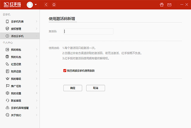 ④输入激活码,勾选[我已阅读云手机使用条款],点击[确定],激活添加成功