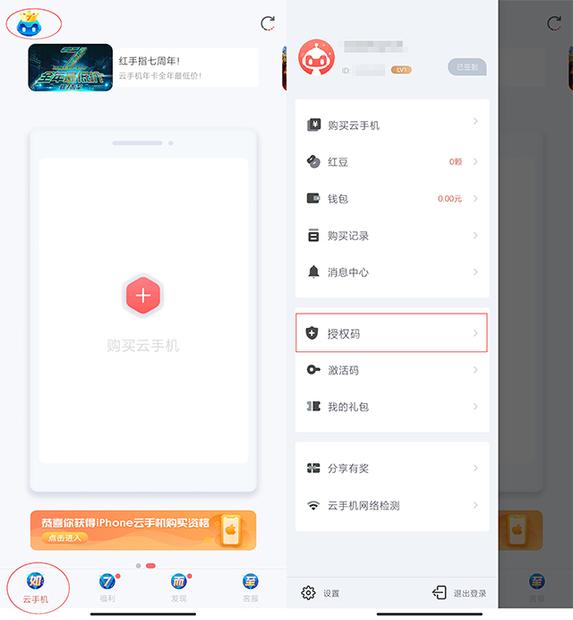 ②点击底部菜单Tab[云手机],点击左上角头像进入用户菜单选项界面