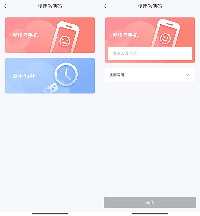 ③点击[激活码],点击跳转进入[使用激活码]界面,选择[新增云手机]/[云手机续时]