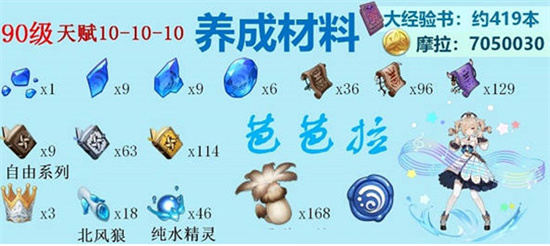芭芭拉是一名四星奶妈,突破需要慕风蘑菇、自由系列天赋书、禁咒绘卷、纯水之心等材料。