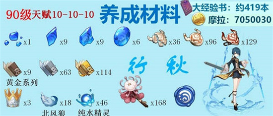 行秋是一名集挂水、输出、抗打断、伤害减免、回血为一体多功能型四星水系单手剑角色,需要霓裳花、黄金系列天赋书等突破材料。