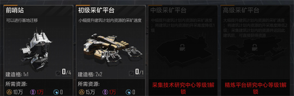 初级采矿平台只有最基础的提升开采效率的功能,仅仅作为过渡使用,因此建议只建造一个初级采矿平台即可。