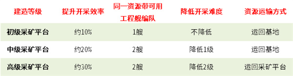 高级采矿平台最大的改变,是工程舰在平台范围内开采的资源不再运送回基地,而是直接送到平台。这一改变将极大程度地提升我们获取资源的速度,也不用再考虑上文提到的平台建造技巧。