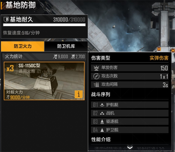 防卫火力是必不可少的,最初的防卫力量就只有最基础的SG—1150C型的通用火炮,效果非常一般,必须要尽快修建基地近防系统,配置足够多的基地防卫舰载机才行更好的抵挡外部的侵袭。