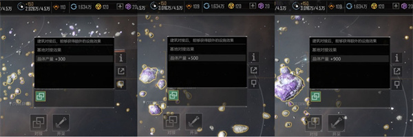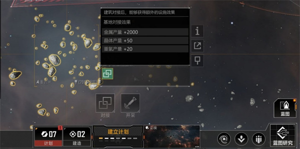 基地可以与资源带进行对接,与不同的资源带对接会有不同的对接效果,对接金属带会增加基地的金属产出,依次类比,与尘埃对接则会对三种资源都会有一定程度的加成。