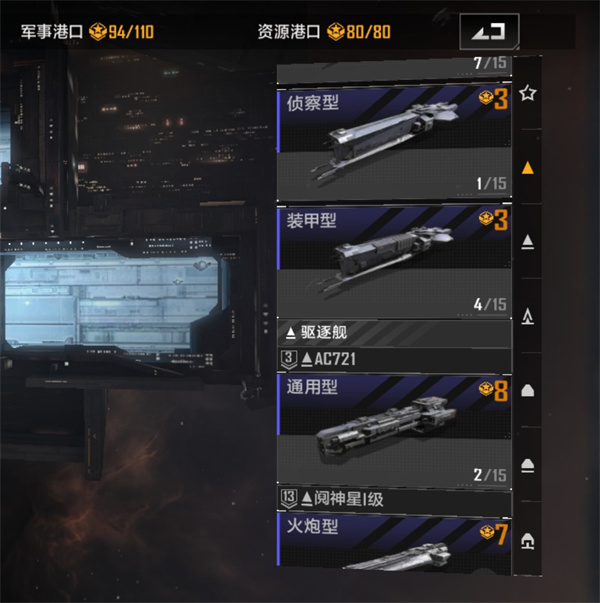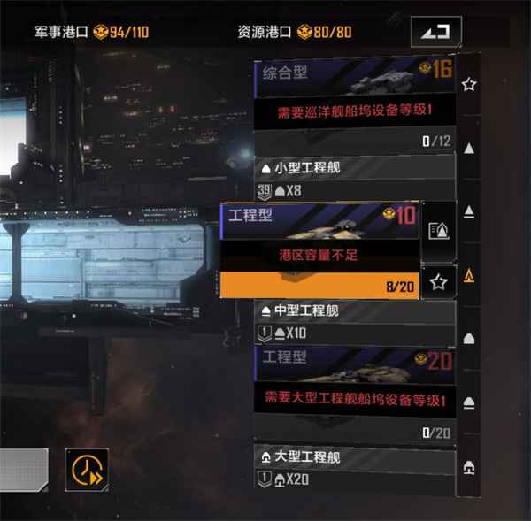 2、 还有就是港区容量的限制,港区分为两部分,军事战舰占据军事港口,工程舰占据资源港口。
