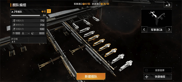 我们可以根据不同舰船的站位进行编组。也可以查看舰队整体数据,按照对舰火力、防空火力、攻城火力、巡航速度等数据进行针对性编组,以应对星系内作战、基地防御、城池攻打及快速支援等作战意图。