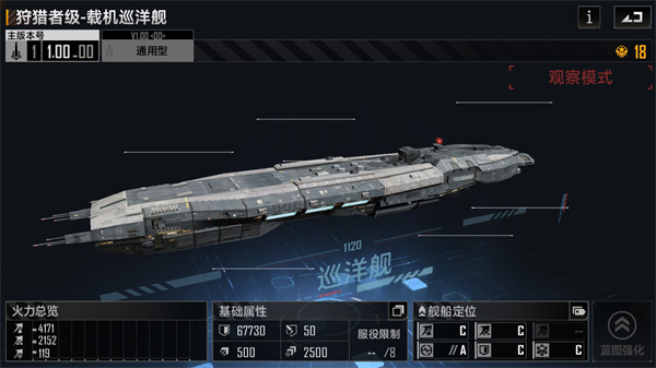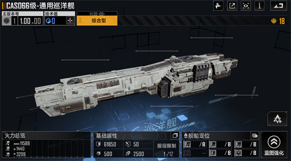 其基础型号为通用型,单看面板数据伤害很低,装甲系统尚可,因为这艘战舰的定位是载机巡洋舰,可以搭载4架中型战机,如果使用的话非常考验中型战机的强度,鉴于目前中型战机并无过分强的存在,在未来更新时有可能翻身,但当前不推荐培养。