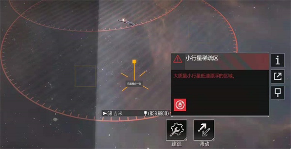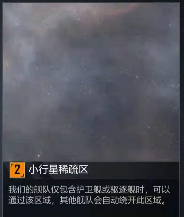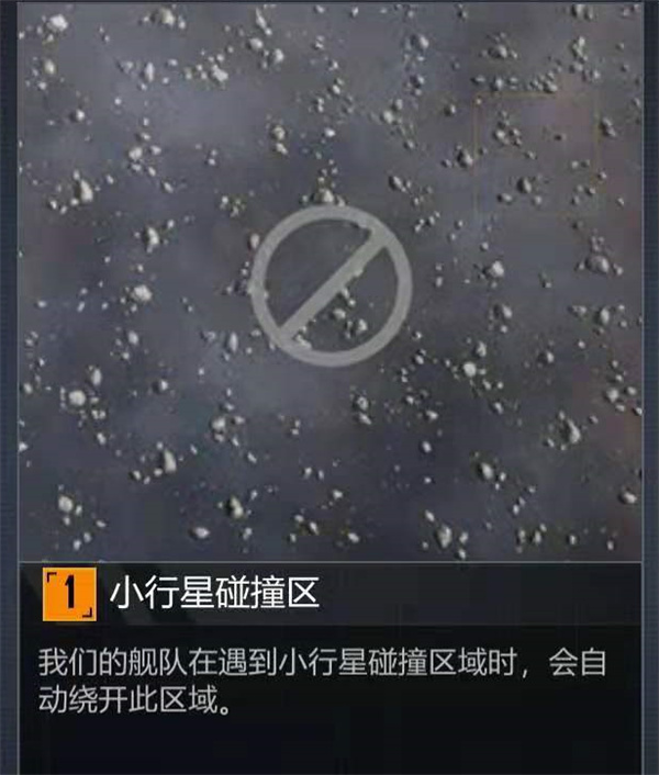 这片区域分布着零散的小行星,越是大的目标越容易被击中,仅当舰队只有护卫舰或驱逐舰时,可以通过该区域,其他舰队会自动绕开此区域。