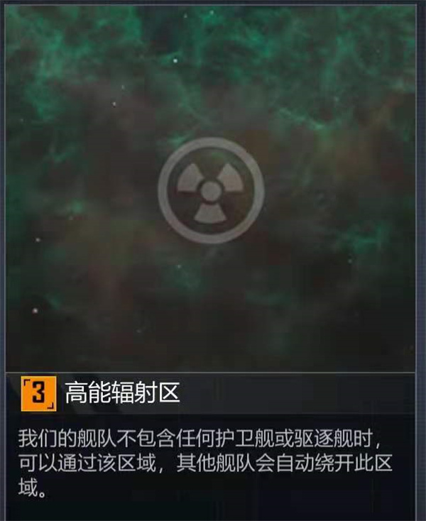 这片区域有着极强的辐射,小型战舰无法通过,只有舰队不含护卫舰和驱逐舰时才可以通过这片区域,其他舰队会自动绕开此区域。