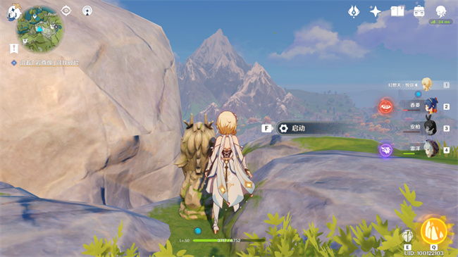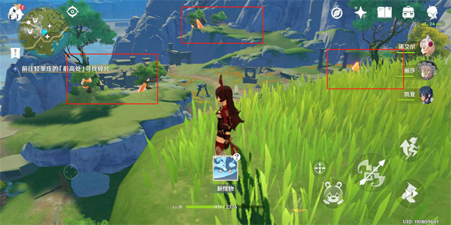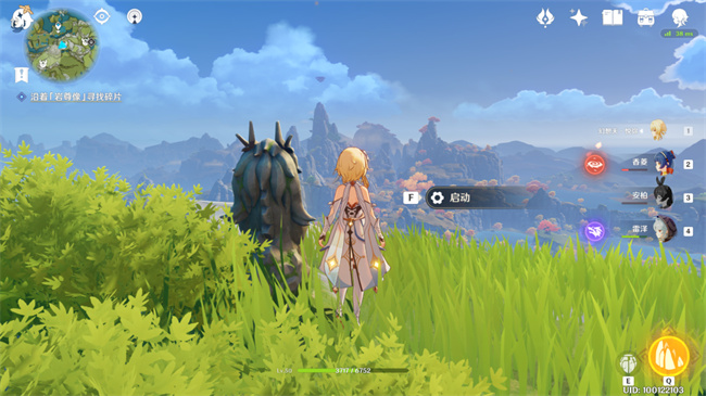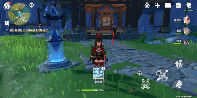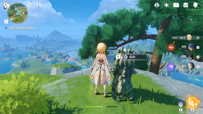 5、对话完之后,传送到轻策庄的传送点,过去与若心奶奶对话,她要求我们沿着岩樽像寻找碎片。