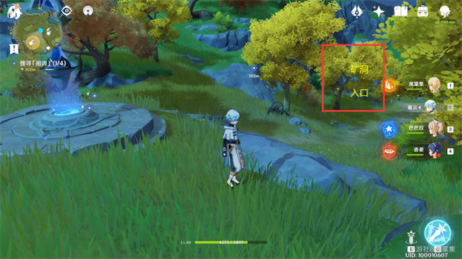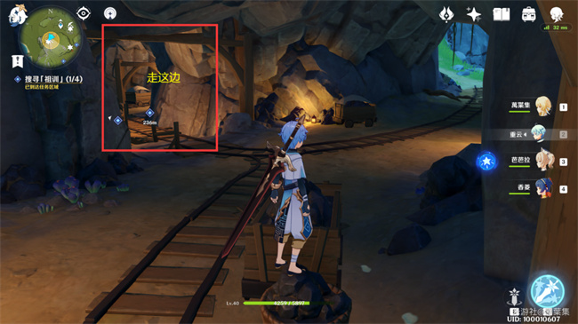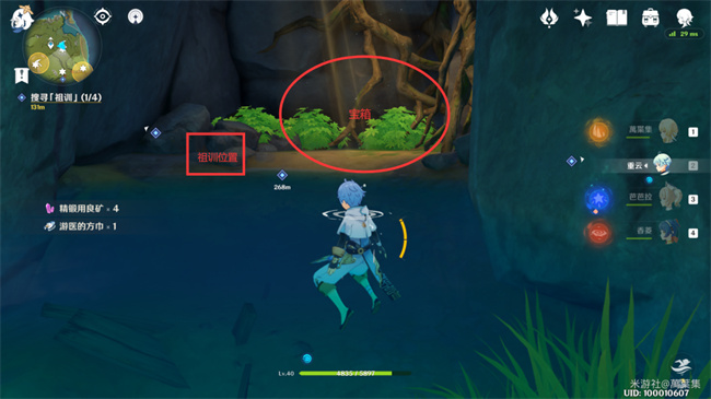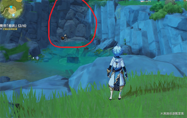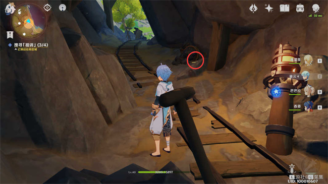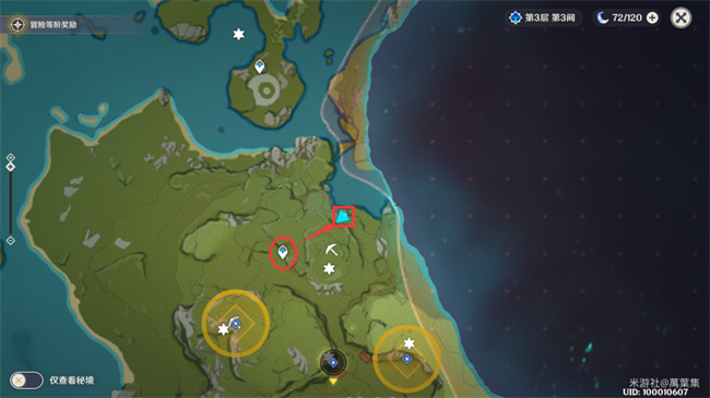 下图的红圈是洞口,有火药桶和一个丘丘人,需要把假墙砸开才能进入,之后就能在矿洞看见箱子。