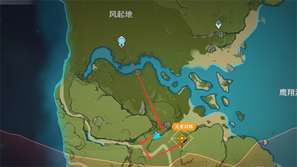 ① 在庙宇门口跟凯亚见面(上一个庙宇可以靠之前开启的传送锚点快速到达,而后面的庙宇只能跑过去了,这里推荐按下图的路线前进,开启七天神像可以开启下一部分的蒙德地图显示,开启锚点、庙宇和七天神像后下次到附近探索就可以直接传送了,一劳永逸。)