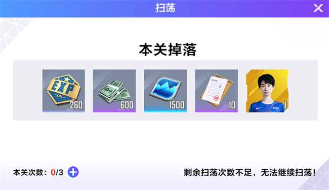 通关过的每一场赛事都可以用扫荡来快速获取资源,普通训练赛不限挑战次数。在卡关时可以用扫荡快速获取经验值,升级后提升战斗力来继续推图。不过,平时并不建议浪费体力在这里。