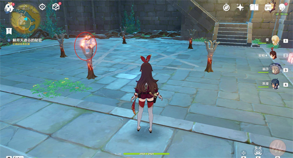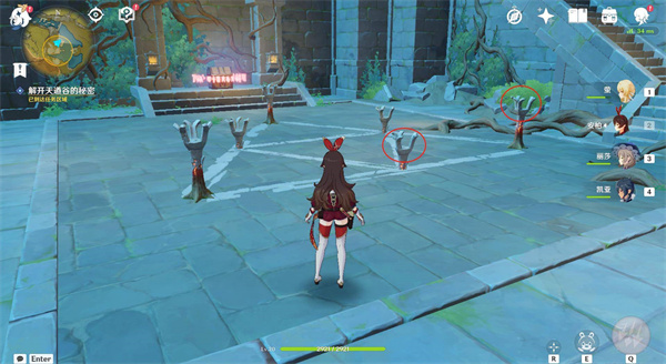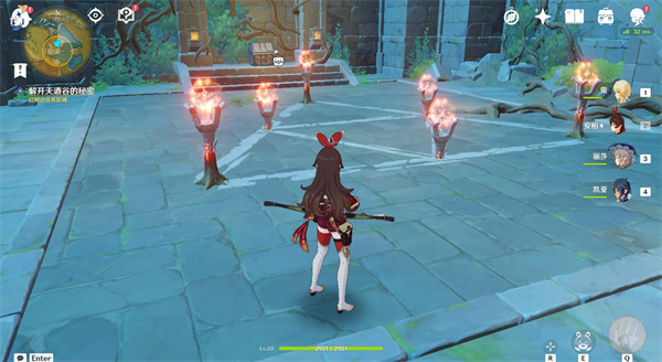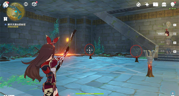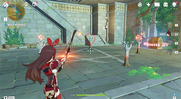 17、第一层石塔有六个火把,三个完全在地上,三个被埋了一半在地下,共两种状态的火把。两种状态各选一个,使用火元素攻击后点亮它们。
