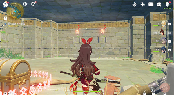27、再来看向发光体正前方那面墙上的火把,按顺序点亮第五、第六根火把。