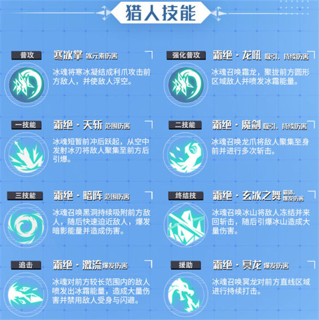 吸引、持续伤害。冰魂召唤霜龙,聚拢前方圆形区域敌人并喷发冰霜能量。