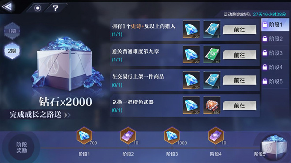 2期活动一共分为5个大阶段,每个阶段各有10个小项,共计50个小任务。每个任务完成后给20钻石,共计可获得1000钻石。2期的阶段奖励全完成共计奖励3700钻石,结合小任务给的,共计可以获得4700钻。