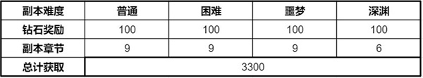 统计了一下,目前副本一共四个难度,普通,困难,噩梦,深渊,前面是哪个难度,每个难度各有九个章节,深渊是装备副本,一共6个本,全部完美通关领取所有宝石,共计可获得3300个钻石。