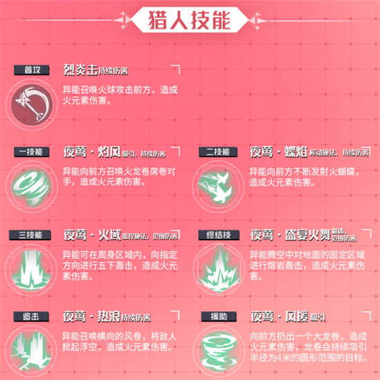 持续伤害。异能召唤横向的风卷,将敌人掀起浮空,造成火元素伤害。