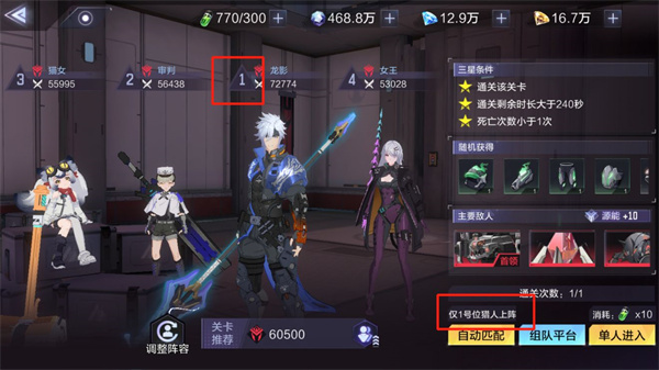 【tips】:匹配后组成队后,队内所有人都只上阵自己放在出阵1号位上的猎人。这也就导致玩家在匹配状态下,可能一整队都匹配的是同一个角色。(比如说前期幻影副本的匹配哈斯特居多,强袭的副本匹配女王居多,都是有可能的。)