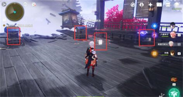 旅行者接着向前走,放置供物,前往下一处,到达后看向右边,有一个宝箱。