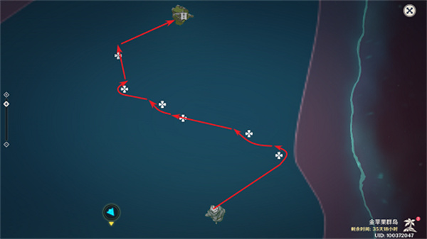 2、与夜鸦对话,帮他清理洞中的丘丘人,清理后出来,在山顶找夜鸦,然后破开迷雾,如图所示路线图,主要听船长指挥,图只是大概流程。