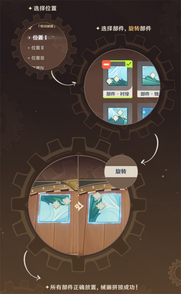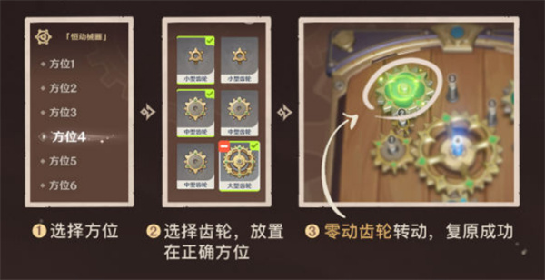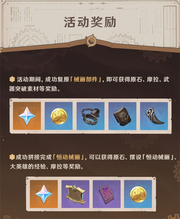 ③ 旅行者将六个「械画部件」全部复原后,可将「械画部件」以正确的角度安置在特定位置,以拼接成整幅「恒动械画」。拼接完成后,可以获得原石、摆设、大英雄的经验、摩拉等奖励。
