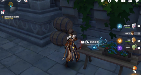 4、在平台上能够看到几个丘丘人,然后在旁边的木桌子上就能够找到这个回声海螺了。