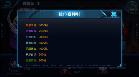 排位赛除了体现玩家实力之外,最大的好处就是赛季皮肤和大量钻石奖励,是获得钻石的重要来源,必须参加。每个段位都有不同的钻石奖励,这里就得依靠自身的实力和技术了,当然也可以找大神带,争取拿到更多奖励。