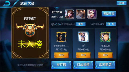 武道大会也可以获取大量钻石和金币,名次越高奖励越多,每天五次,也可以用钻石买次数从而提升排名。这里推荐用貂蝉、宫本武藏和甄姬,进去控制貂蝉第一时间往左边或右边位移,然后侧边过去进行输出即可,基本稳赢。