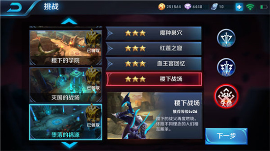 冒险模式下的挑战,每一关都有丰厚的金币和铭文奖励,达到满星时,开启宝箱还可以获得钻石,但只能领取一次,所以还没完成的绝对要去打,收入非常可观。这里最难的关卡就是大师级的血王宫回忆,在网上有很多大神分享通关攻略,学习掌握之后很容易过。