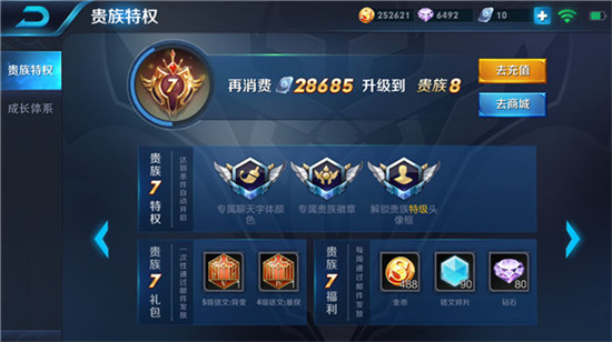 不管是什么贵族等级,每周都可以领取一定的金币和钻石,也可以在微信QQ领取贵族专属礼包,虽然不多,但是积累起来还是不错的。贵族等级是根据消费的点券数额来提升的,点券则需要充值,有条件的可以尝试。