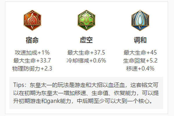 ① 想要提升东皇太一这个英雄的攻速可以使用【宿命、调和、虚空】这一套铭文,既为东皇太一增加了血量,又为他增加了10%的攻速;