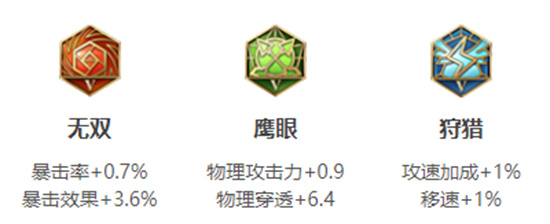 铭文可以使用【无双、鹰眼、狩猎】,增加了暴击和物理穿透,攻速和移速也提升了10%。