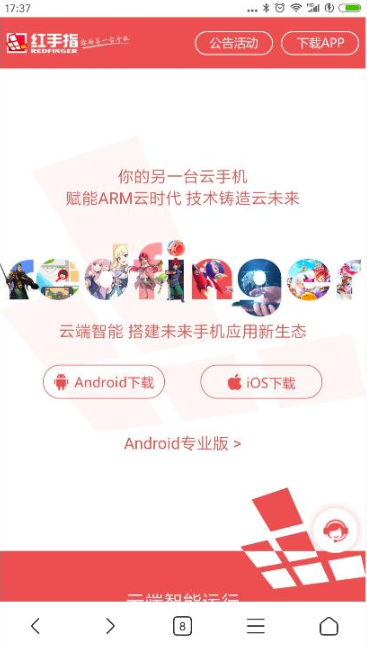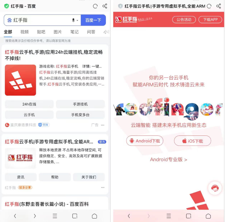 1.红手指云手机安卓下载-红手指云手机官方最新版本下载:手机浏览器搜索关键词“红手指云手机”或“红手指”,点击有“官网”标志的信息即可进入红手指云手机官网;在官网首页点击“安卓版下载”按钮,即可完成红手指云手机安卓下载安装;