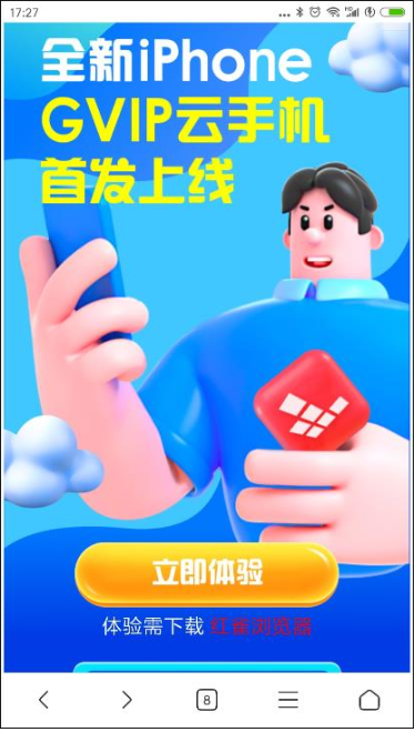 2)点击界面上的“立即体验”或者“体验需下载红雀浏览器”,即可跳转App Store下载红手指云手机iOS端APP,即红雀浏览器;