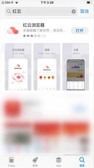 2.可在苹果手机内置App Store内搜索“红云浏览器”或者“红雀浏览器”点击下载即可实现红手指苹果下载安装;