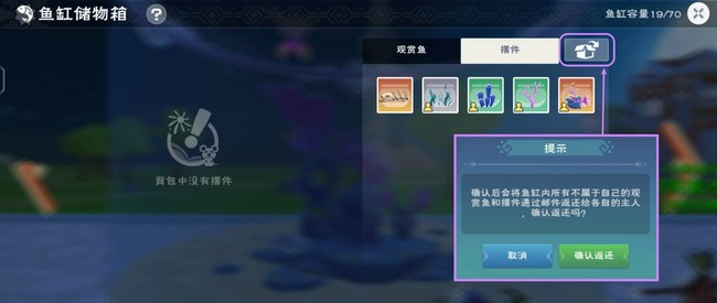 鱼缸储物箱内点返还按钮,可以将鱼缸内除自己以外所有人的观赏鱼和摆件通过邮件返还给他人。