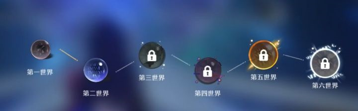 模拟宇宙一共有六个世界,前两个世界属于新手教学性质,后四个世界区别是产出遗器的品级和类型不同。想要解锁更高难度的世界,需要先通关前置世界。
