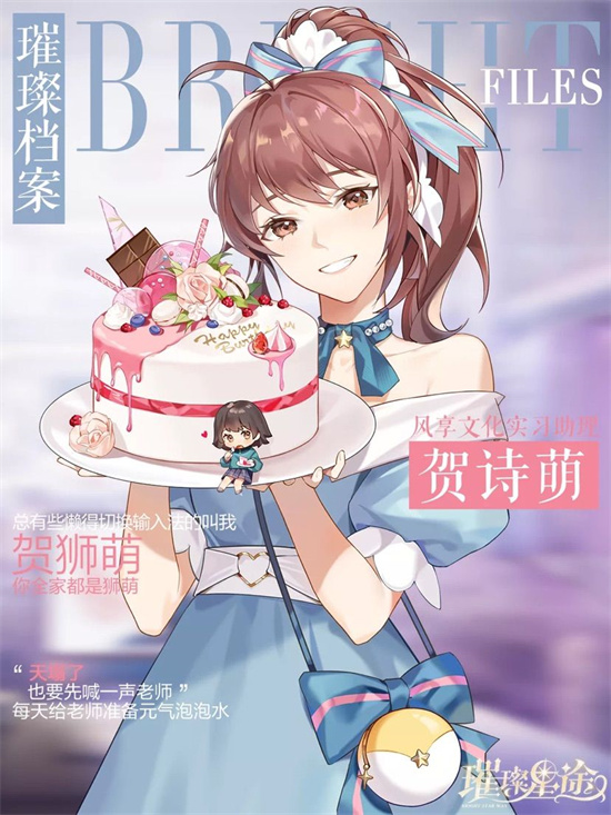 璀璨星途除了七位艺人外,风享公司还有很多员工呢!每天和经纪人你一起工作的,都是什么样的人呢?小狮子!各位经纪人应该都不陌生吧!下面小编为大家整理璀璨星途实习助理小狮子游戏资料介绍: 一、璀璨星途实习助理小狮子游戏个人档案 1、姓名:贺诗萌 2、配音CV:张惠霖 3、昵称:小狮子 4、性别:女 5、年龄:20岁 6、爱好兴趣: ① 最喜欢的人:女主角、风享文化的所有艺人。 ② 见了面会紧张的人:陆唯 ③ 最近的快乐:昨!天!按!时!下!班! ④ 性格:十分崇拜经纪人的全能小助理,偶尔会犯花痴的天然呆。 ⑤ 昵称的由来:原来早上不打理头发的贺诗萌是一只蓬头乱面的小狮子!