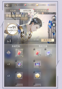 1、高级定制:首月价格128,现价98,完成任务提升定制等级可领取珍贵SSR限定造型李佑丞·异域王子, 以及大量奖励。2、累计奖励(包含免费奖励) :李佑丞·异域王子(SSR) , 陆唯·沉醉之夜(SR),黑卡*15,啵啵邮票*15,钻石*850高定积分*3800,璀璨星愿*30,金币*300000,元气泡泡水(体力)*420,星途横幅*8,助威牌*20免费累计奖励:陆唯·沉醉之夜(SR),黑卡*5,啵啵邮票*5,钻石*240,高定积分*900,金币*100000,元气泡泡水(体力)*210,助威牌*20ps:每期高定持续45天,可爱的经纪人需要一点耐心即可全部领取到全部开特权笑用的奖励。当然