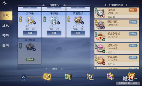 在剑侠世界3种每个玩家每天都可以做的日常活动,可以完成是【千机楼】、【龙泉秘境】、【梦华录】和【官府通缉】等相关日常任务获取相关奖励。玩家可以从任何一个活动开始做,系统会托管接着完成其他活动,没时间长时间打游戏的少侠可以选择直接托管完成。托管可以选择红手指云手机全天托管获取资源,无肝玩家可以快速改进,轻松获取和培训!想要在剑侠世界3中快速升级,获取经验资源,提升等级和战斗力。 一、剑侠世界3每日日常任务有哪些? 【千机楼】、【龙泉秘境】、【梦华录】和【官府通缉】 二、剑侠世界3每日日常任务完成奖励有哪些? 1、活跃奖励 每个玩家每天有5个活跃度宝箱可以拿,宝箱里可以开出元宝、玄晶