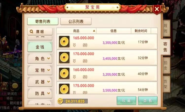 有这么一款手游除了正儿八经的玩法玩家还能够在里面体验到“彩票”、“炒股”、“抽奖”这些现实金融业的操作这就是“问道手游”猜中翻倍奖励.PNG游戏的经济系统很完善游戏推出的“聚宝斋”平台不仅手游官方能赚钱平民玩家也能赚钱真正的做到了“自由交易”买涨买跌全看自己.PNG但游戏里物价是浮动的新区和老区的物价就不一样1E游戏币等于多少RMB?游戏装备、宠物值多少钱?这些估价都要跟着市场走日常押镖赚饭钱.PNG今天红姐就告诉大家作为一名硬核手游玩家“估价”是最基本的技能不管你卖什么游戏道具角色、宠物、装备、道具第一件事就是货比三家用属性对比属性价格不会相差太大零投入平民也赚钱.PNG但也有特别难卖掉的有